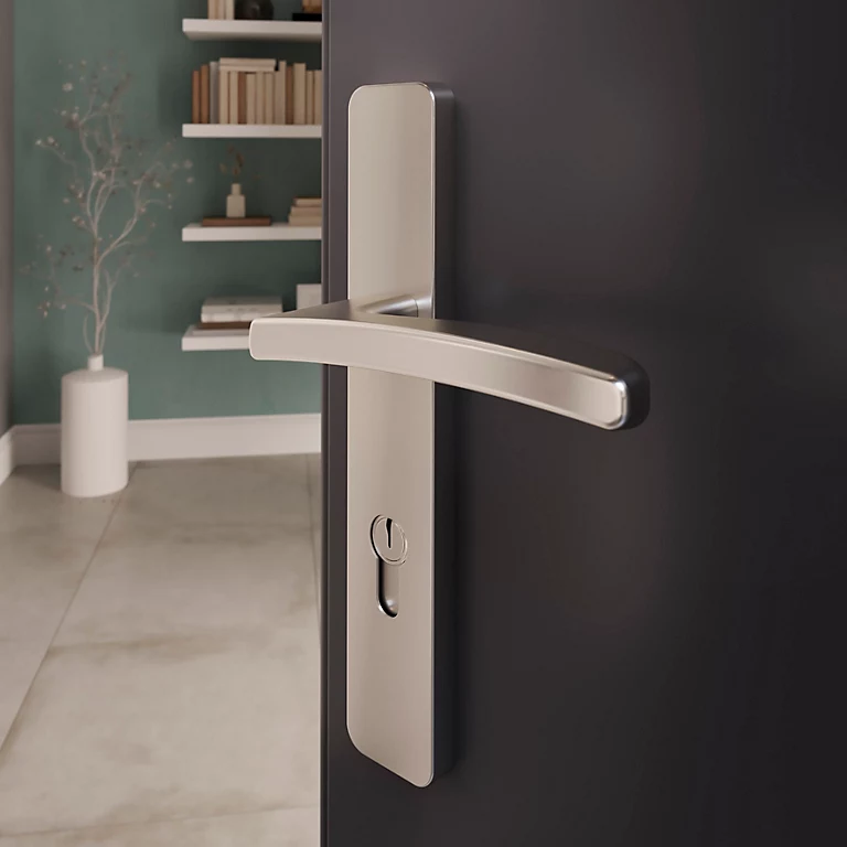 Ensemble poignée sur plaque rectangulaire GoodHome Irvil effet nickel satin gris L.126.5mm x l.24.5mm entraxe 195mm