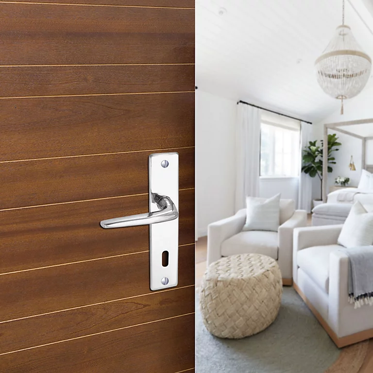 Ensemble poignée sur plaque rectangulaire serrure Colan effet chromé brillant gris L.106mm x l.39.8mm entraxe 165mm