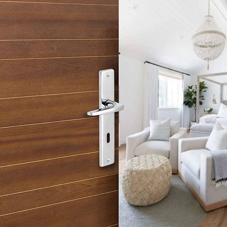 Ensemble poignée sur plaque rectangulaire serrure Colan effet chromé brillant gris L.106mm x l.39.8mm entraxe 195mm