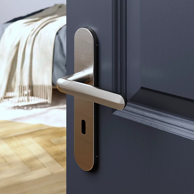 Ensemble poignée sur plaque rond serrure GoodHome Garlan effet nickel satin gris L.125mm x l.42mm entraxe 165-195mm