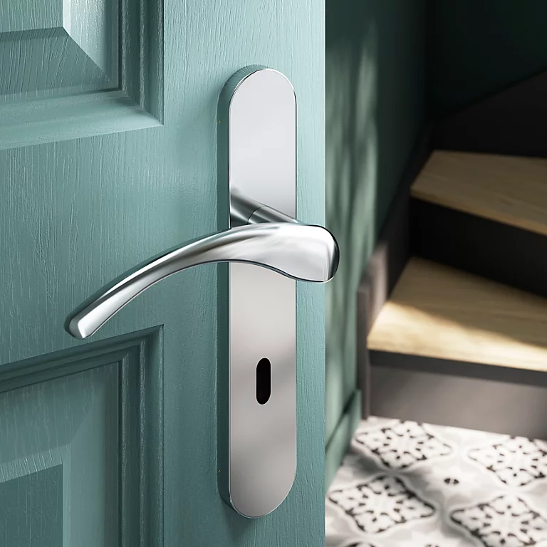 Ensemble poignée sur plaque rond serrure GoodHome Ruis effet chromé gris L.138.5mm x l.42mm entraxe 165-195mm