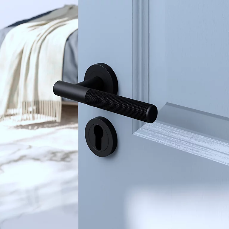 - Disponible en plusieurs finitions, cette poignée de porte sur rosace peut être associée à des poignées et des boutons de meuble de la même gamme pour créer un style coordonné