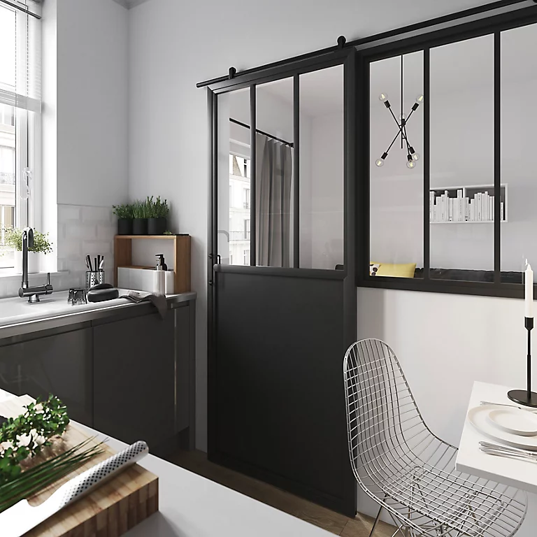 Ensemble porte coulissante atelier noire 3 vitrages H.204 x l.83 cm et système de rail en acier