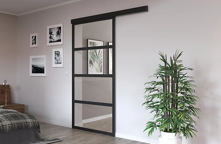 Ensemble porte coulissante atelier noire en verre H.204 x l.83 cm et système de rail en acier