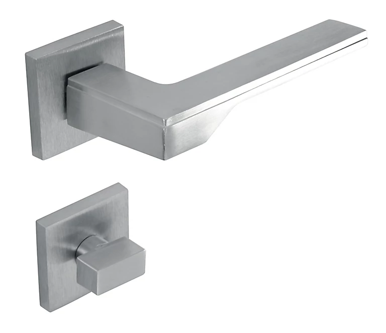 - Poignée sur rosace carrée finition satinée pour une ligne moderne et épurée. Comprend : poignées + bouton condamnation + visserie + 2 carrés (7 mm et 8 mm). Compatible pour tout modèle de serrure à condamnation